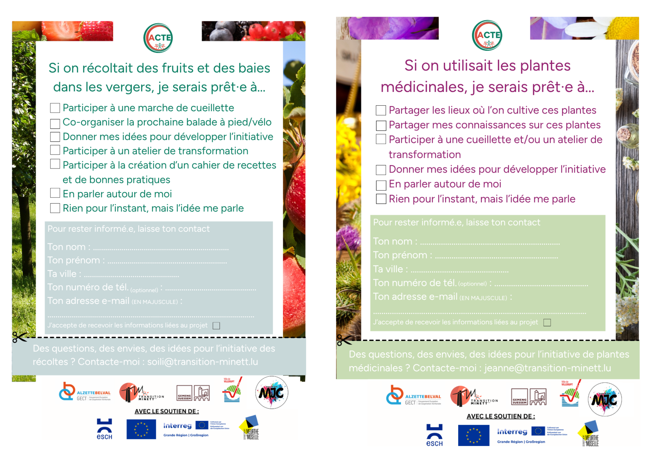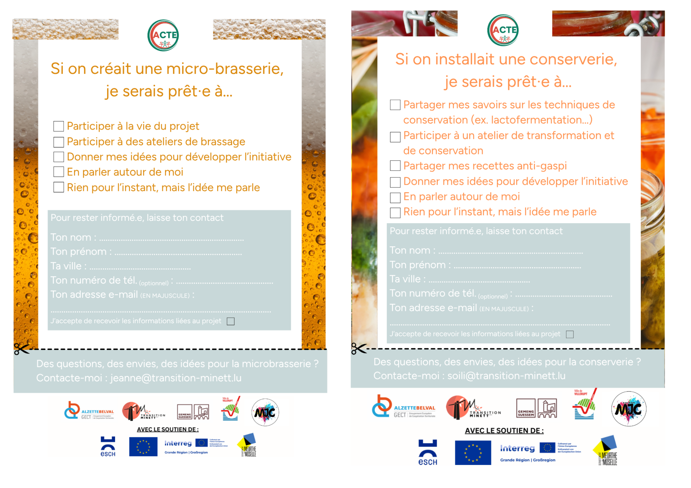 ACTE accompagne les citoyen.ne.s dans leurs initiatives pour accélérer la transition écologique sur le territoire transfrontalier d’Alzette Belval. A ce jour, grâce à l’appui des partenaires du projet, les initiatives sont aujourd’hui en cours de développement, avec pour objectif d’avoir un impact durable et positif sur le territoire des 13 communesTous ces projets sont ouverts aux citoyen.ne.s intéressé.e.s qui voudraient s’y joindre selon leur degré d’implication plus ou moins fort : tout le monde est le bienvenu 🙂