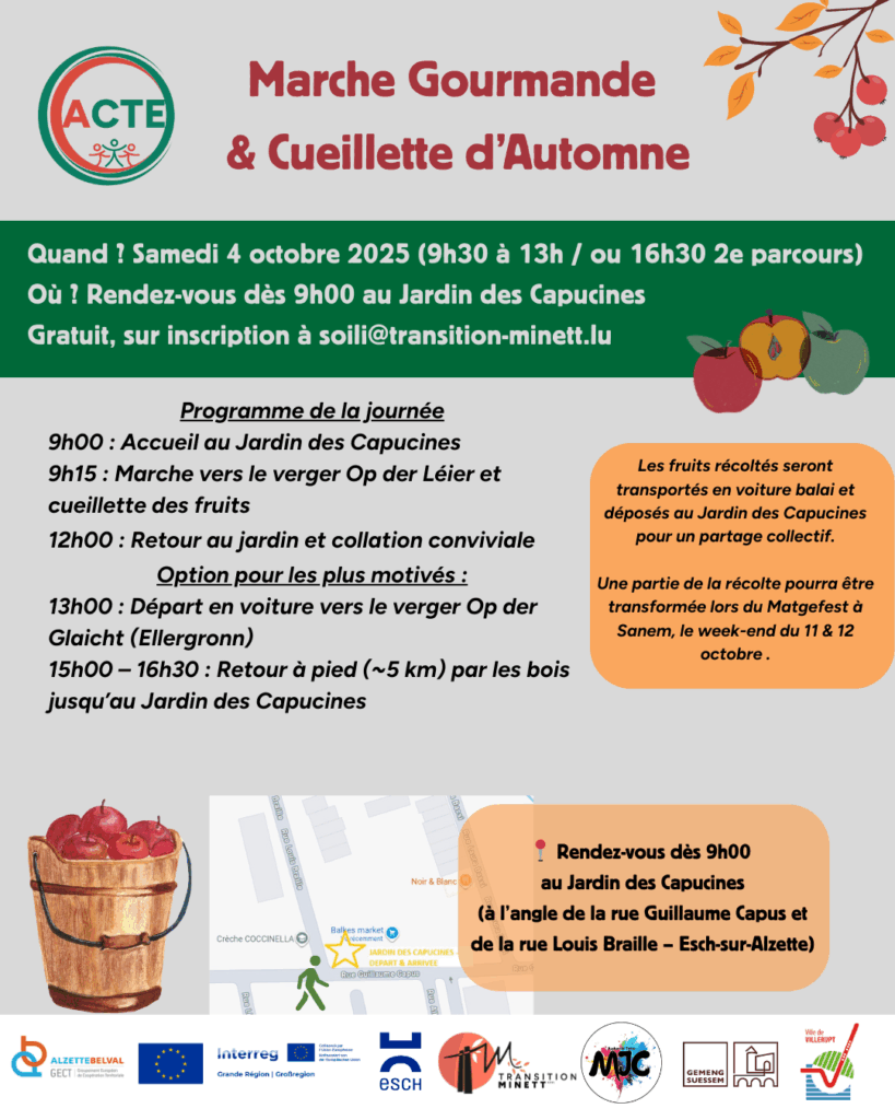 On vous invite à une belle journée de marche, de cueillette et de convivialité le samedi 4 octobre 2025, de 9h00 à 16h30.